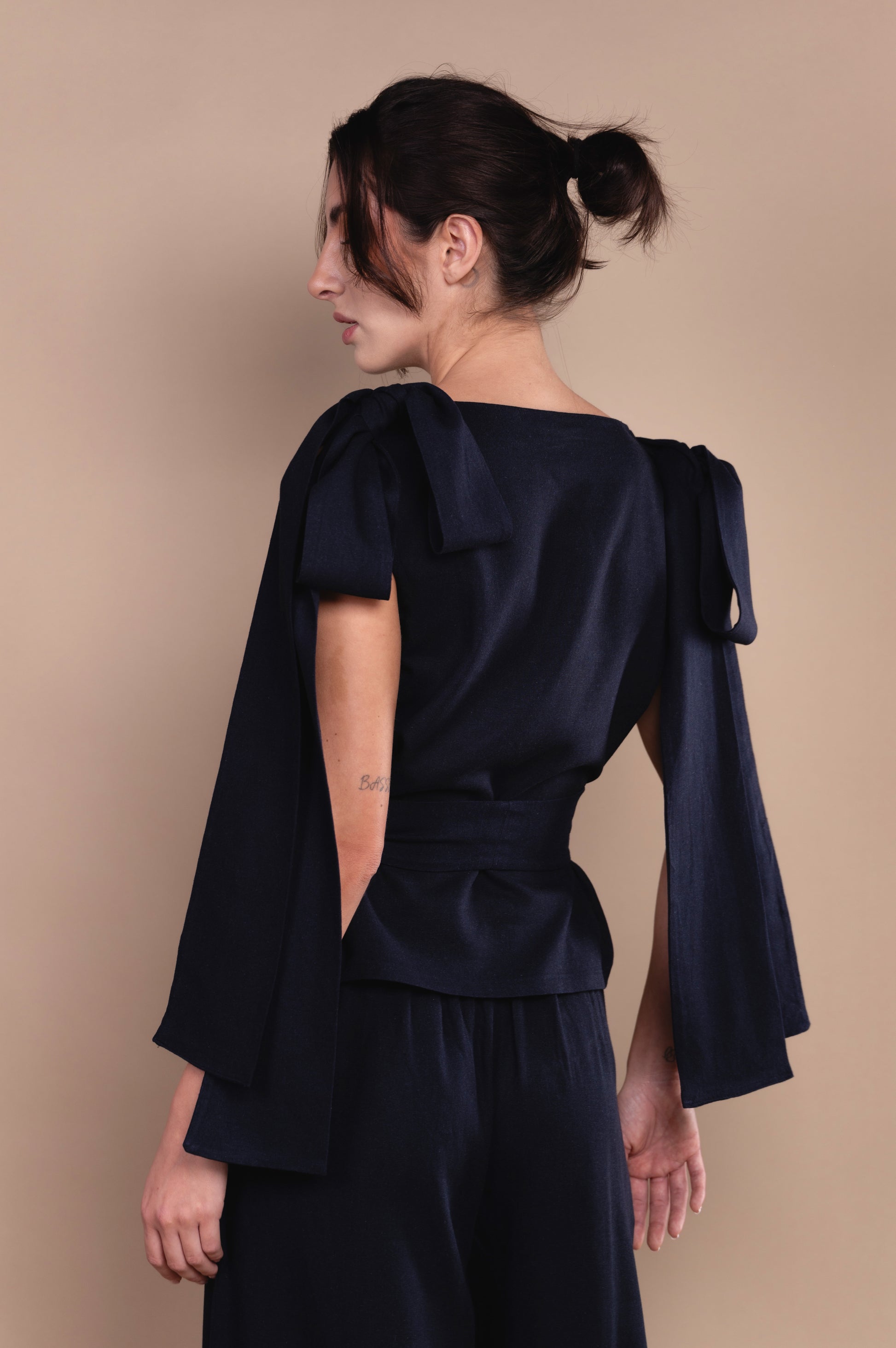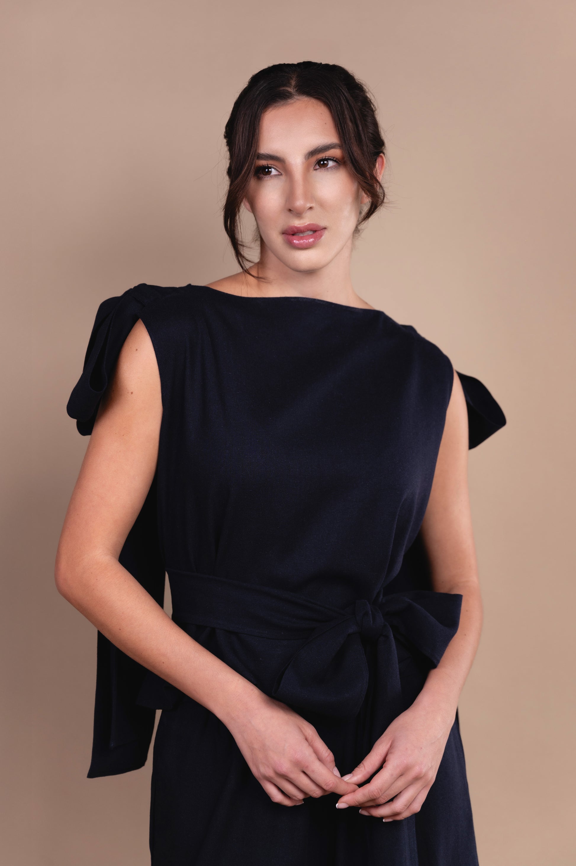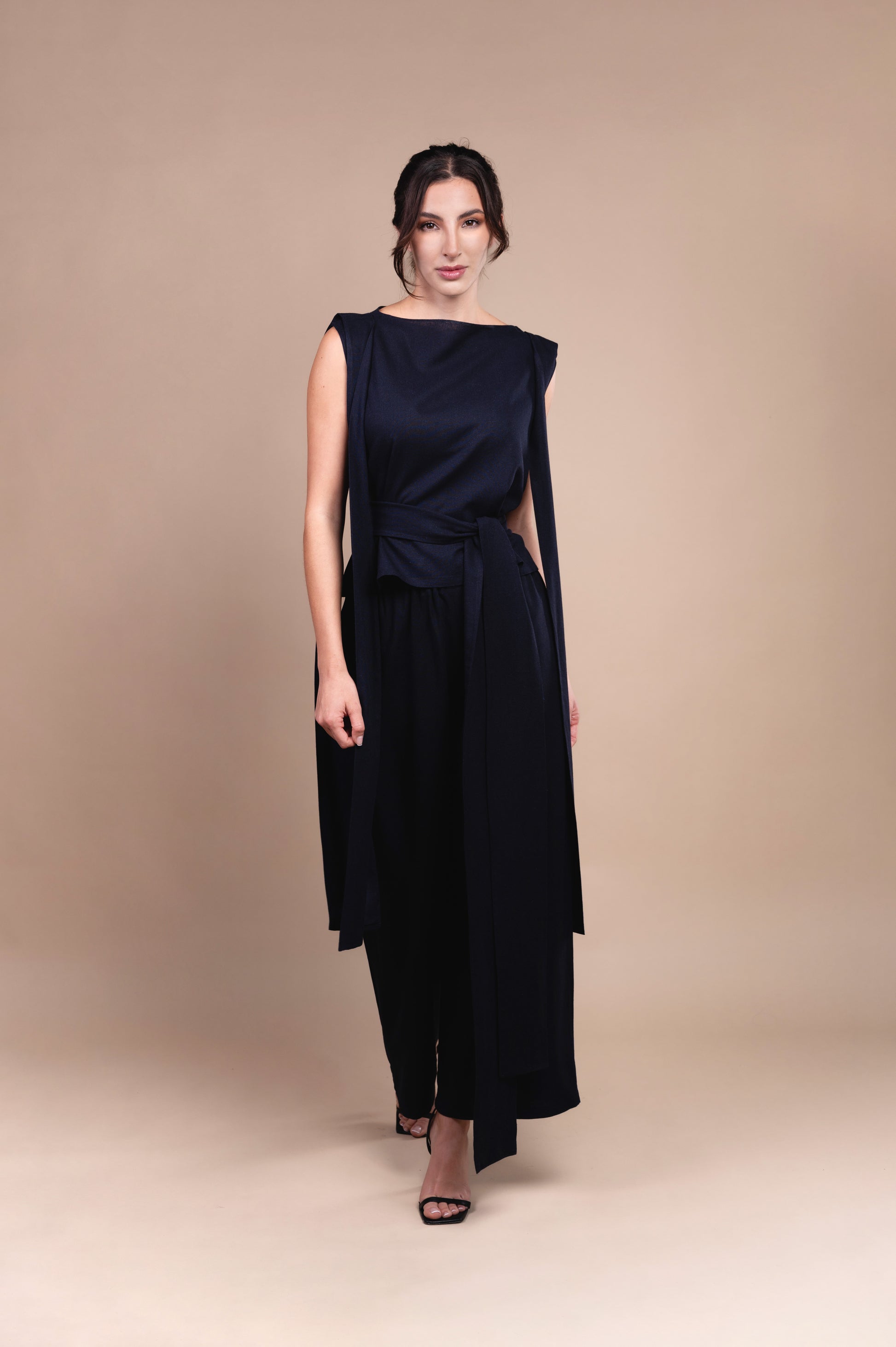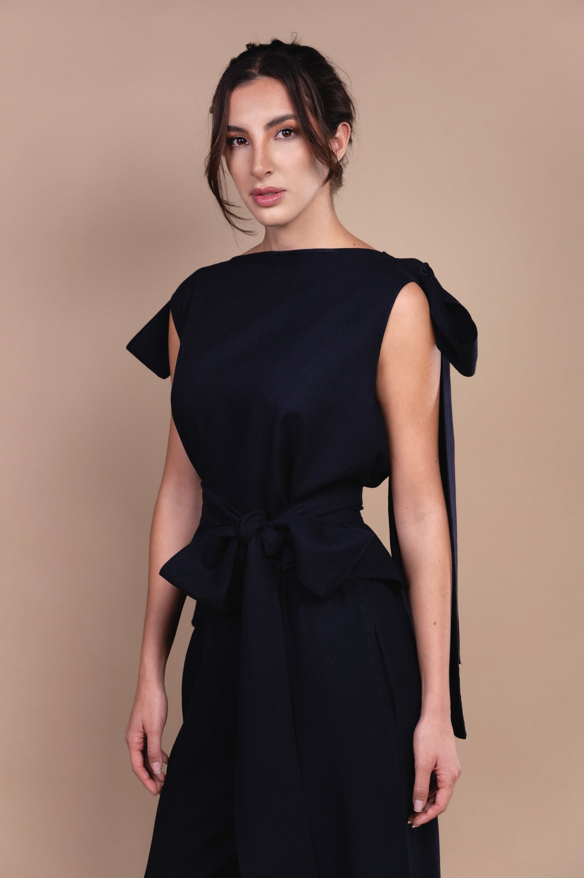 Conjunto elaborado en lino azul marino, que te otorga mucha formalidad y elegancia para cualquier tipo de evento o reunión, el cual te permite jugar con tu propio estilo, ya que los listones en los hombros ayudan a que los uses de acuerdo a tu sello personal, te damos una idea que pueden funcionar como moños o bien dejarlos ser libres, el cinturón puedes usarlo o simplemente dejarlo suelte y que te de comida en cada paso. |
