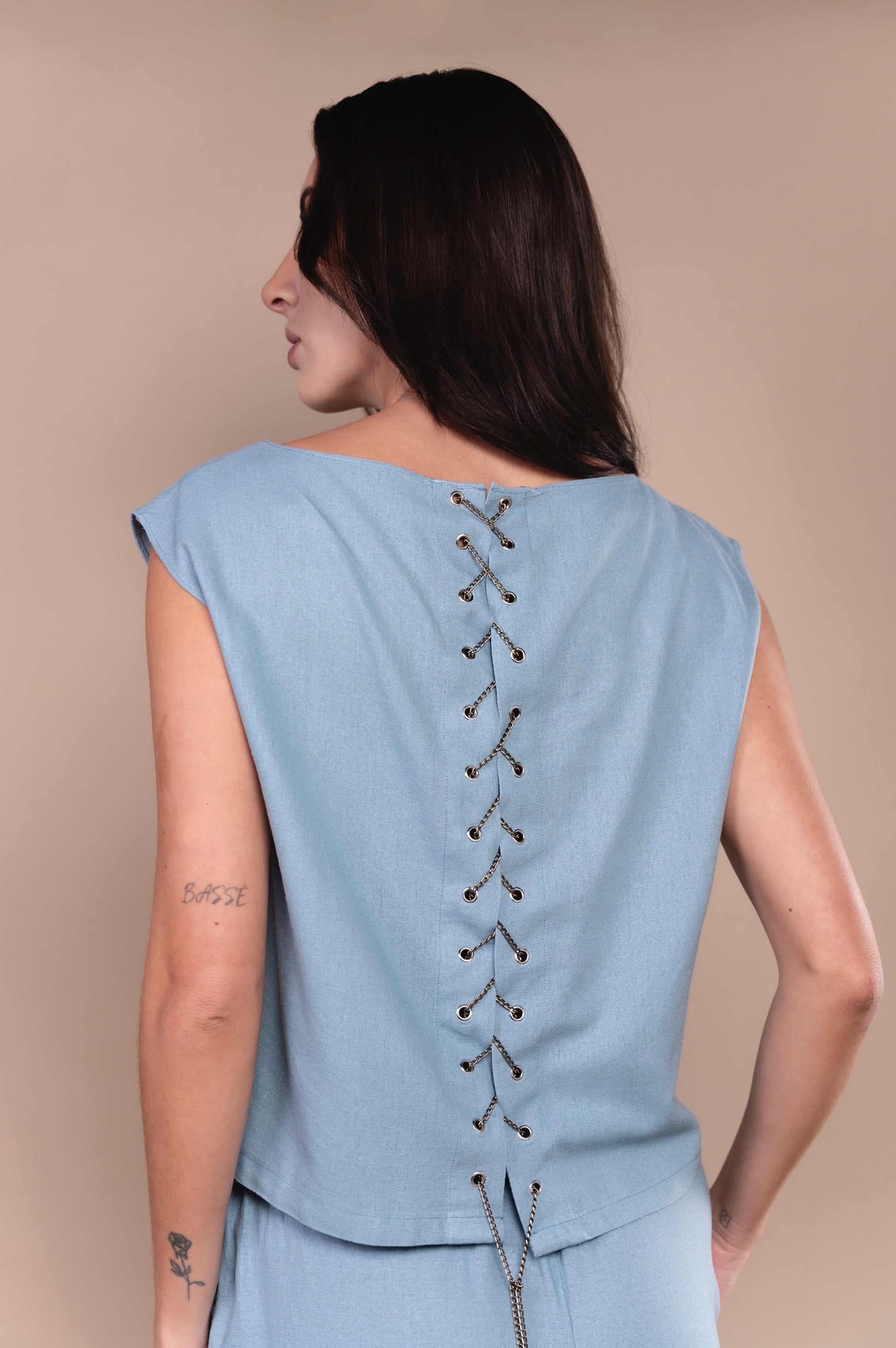 Conjunto pantalón y blusa con trenzado en metal en la espalda, resaltando la commodidad del diseño